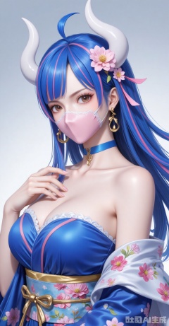 lvjing,pifu,Ulti\(one piece\),lvjing,baoshi,lvjing,blue hair,two-tone hair,pink hair,brown eyes,horns,white horn,mouth_mask,fair_skin,