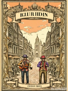 BSCT, Vintage illustration of a street musician playing a violin on a bustling corner, dressed in a colorful outfit and a hat, with a open case for tips. The musician is depicted with passion, lost in the melody amidst a crowd of onlookers. The background features a stylized cityscape and twinkling lights. The style is reminiscent of old urban posters, with lively line work and vibrant hues.