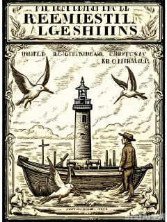 BSCT, Vintage illustration of a fisherman casting his line from a weathered boat, dressed in oilskins and a sou'wester hat, surrounded by seagulls. The fisherman is shown in a focused stance, amidst a choppy sea. The background features a stylized lighthouse and a dramatic sky. The style mirrors classic maritime illustrations, with intricate details and nautical motifs.