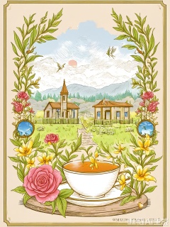 BSCT, A detailed, colorful print illustration featuring a porcelain teacup labeled "Afternoon Delight" in the spotlight, surrounded by a selection of tea leaves and a slice of lemon on a lace doily. The background depicts a sunlit garden with blooming roses, a birdhouse, and a stone bench. The style mirrors classic tea party illustrations, with fine details and soft colors. The overall atmosphere is elegant and relaxing, blending the ritual of tea with garden serenity.