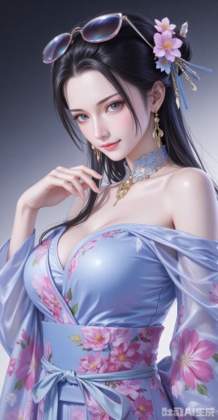 1girl,breasts,solo,japanese clothes,hair ornament,kimono,flower,hair flower,sash,blue kimono,large breasts,choker,looking at viewer,cleavage,bare shoulders,obi,off shoulder,earrings,smile,jewelry,floral print,closed mouth,makeup,from side,long sleeves,cover,simple background,gradient_background,Close-up details,outstanding style,adding a touch of dimension to your images without compromising details,close-up,