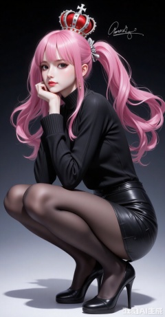 1girl,solo,pantyhose,high heels,looking at viewer,black footwear,squatting,sweater,quad tails,full body,parted lips,black sweater,earrings,signature,black nails,long sleeves,parted bangs,jewelry,pencil skirt,skirt,bangs,turtleneck,nail polish,black pantyhose,dress,(Black background:1.2),simple background,