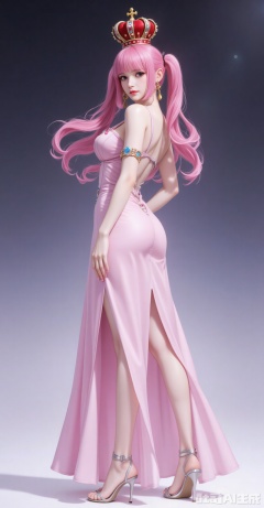 1girl,dress,solo,high heels,pink dress,jewelry,breasts,full body,earrings,backless dress,standing,from side,legs,backless outfit,bare shoulders,ass,looking at viewer,armlet,sandals,bare legs,side slit,