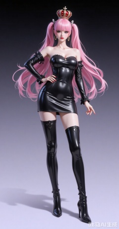1girl,solo,dress,earrings,jewelry,boots,long hair,hand on own hip,thigh boots,full body,black footwear,latex,black dress,detached sleeves,bare shoulders,strapless,short dress,thighhighs,shiny clothes,looking at viewer,strapless dress,standing,hoop earrings,breasts,red lips,nail polish,high heels,leather,pencil dress,high heel boots,