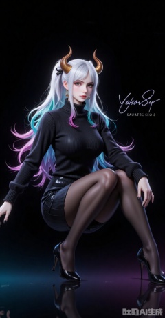 1girl,solo,pantyhose,high heels,looking at viewer,black footwear,squatting,sweater,quad tails,full body,parted lips,black sweater,earrings,signature,black nails,long sleeves,parted bangs,jewelry,pencil skirt,skirt,bangs,turtleneck,nail polish,black pantyhose,dress,(Black background:1.2),simple background,