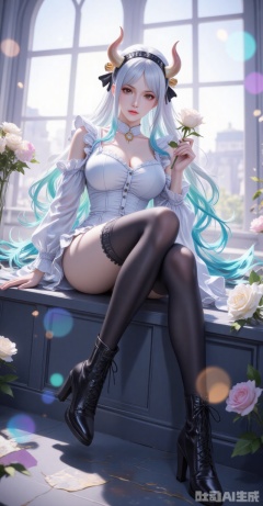 1girl,flower,solo,breasts,thighhighs,hair flower,high heels,boots,sitting,rose,white flower,window,hair ornament,cleavage,holding flower,black footwear,black thighhighs,high heel boots,single thighhigh,shirt,holding,white rose,looking at viewer,hairband,white shirt,frills,full body,black flower