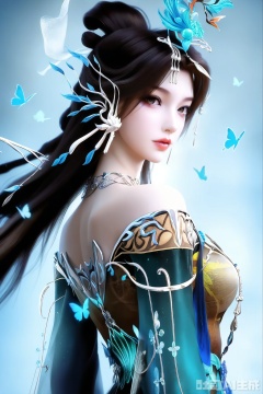 1girl, solo, long hair, looking at viewer, brown hair, black hair, hair ornament, dress, bare shoulders, jewelry, upper body, earrings, looking back, hair bun, butterfly,