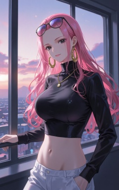 Hina\(one piece\),baoshi,lvjing,Hina\(one piece\),pink hair,black eyes,eyewear on head,long hair,sharp eyes,fair_skin,1girl,jewelry,solo,midriff,earrings,crop top,navel,breasts,pants,looking at viewer,white pants,railing,sky,necklace,ring,window,cloud,long sleeves,against railing,sunset,black shirt,standing,large breasts,cropped shirt,indoors,head tilt,turtleneck,cropped sweater,shirt,smile,stomach,evening,hand in pocket,hoop earrings,simple background,gradient_background,Close-up details,outstanding style,adding a touch of dimension to your images without compromising details,absurdres,colorful,