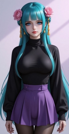 lvjing,baoshi,lvjing,rihe,hair ornament,hair flower,flower,long hair,aqua hair,blue eyes,aqua eyes,blunt bangs,pink flower,1girl,pantyhose,breasts,skirt,solo,ass,large breasts,bangs,black pantyhose,looking at viewer,purple skirt,black sweater,long sleeves,underwear,sweater,turtleneck,pleated skirt,black shirt,gradient background,simple background,simple background,gradient_background,cover,Close-up details,outstanding style,adding a touch of dimension to your images without compromising details,close-up,