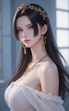 lvjing,black hair,long hair,fair_skin,blue eyes,jewelry,earrings,1girl,solo,dress,jewelry,earrings,white dress,looking at viewer,bare shoulders,upper body,indoors,blurry background,hair ornament,blurry,window,necklace,realistic,cover,simple background,gradient background,close-up details,outstanding style,(baoshi),adding a touch of dimension to your images without compromising details,close-up,