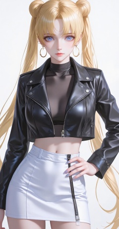 lvjing,baoshi,lvjing,yueyetu,1girl,solo,blonde hair,blue eyes,long hair,twintails,double bun,hair bun,bangs,parted bangs,very long hair,1girl,solo,skirt,earrings,zipper,jewelry,see-through,navel,hand on own hip,crop top,looking at viewer,midriff,shiny clothes,zipper pull tab,long sleeves,white background,simple background,nail polish,white skirt,jacket,cowboy shot,miniskirt,closed mouth,breasts,lips,hoop earrings,latex,contrapposto,standing,9,cover,simple background,gradient background,close-up details,outstanding style,adding a touch of dimension to your images without compromising details,close-up,