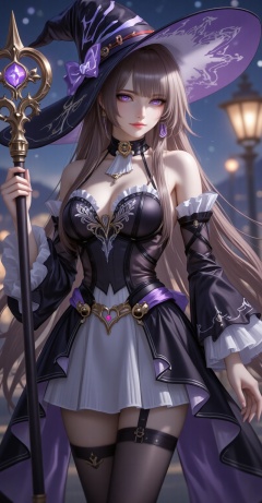 lvjing,baoshi,lvjing,daheita,1girl,hat,long hair,holding,detached sleeves,brown hair,witch hat,purple eyes,staff,holding_staff,dress,thigh strap,looking at viewer,bare shoulders,night,solo,standing,train,breasts,15,cover,simple background,gradient_background,Close-up details,outstanding style,adding a touch of dimension to your images without compromising details,close-up,