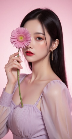 pifu,lvjing,xiaomei,1girl,solo,flower,black hair,pink background,holding,long hair,holding flower,looking at viewer,portrait,parted lips,black eyes,realistic,simple background,one eye covered,pink flower,lips,red lips,white flower,58,cover,simple background,gradient background,close-up details,outstanding style,adding a touch of dimension to your images without compromising details,close-up,