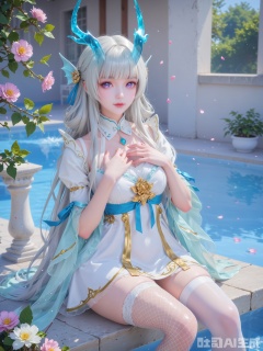 score_9,score_8_up,score_7_up,1girl,looking_at_viewer,realistic,1girl,Vivid Colors,bright environment,sunshine,god light,delicate water,hair_ornament,shiny skin,shiny hair,reflection,(wariza:1.2),dress,flower sea,falling petals,extreme detail description,bright sunlight,frontal lighting,(upper body:0.3),put one hand on your chest,hair,long_hair,(skindentation:1.3),Fishnet stockings,hair,sunshine on face,bright_pupils,light_eyes,sitting_down,(pale_skin:1.3),white stocking,see-through,light_purple_eyes,horn