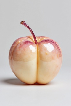 beijihui,Captured from a low-angle perspective on a stark white backdrop,a radiant golden-yellow peach is dotted with fresh water droplets,adding luminous highlights to the piece. The soft,glistening surface of the fruit captures ambient light in delicate reflections,contrasting vividly with its sunlit hue. Its fuzzy stem,subtly tinted with a warm ochre tone,complements the color harmony of the image.,