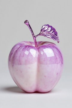 beijihui,Captured from a low-angle perspective on a stark white backdrop, a vibrant pink apple is adorned with water droplets, adding a touch of sparkle to the composition. The apple's shiny, glossy surface reflects a soft glow, creating a stark contrast to the apple's vibrant purple hue. The stem of the apple, adorned with a sparkling purple hue, adds a pop of color to the otherwise monochromatic composition.
