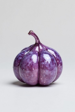 beijihui,Captured from a low-angle perspective on a stark white backdrop, a glossy midnight blue fig is speckled with water droplets, adding a celestial glimmer to the visual. Its sleek, polished skin reflects a dim violet light, sharply contrasting the dark, inky tone of the fruit. A short twisted stem with a faint silver shimmer draws focus within the minimalist composition.