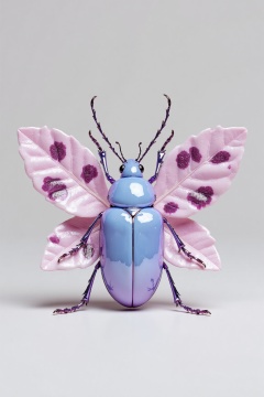 beijihui,Captured at eye-level on a stark white backdrop, a vibrant blue beetle is adorned with a pair of pink leaves. The beetle's wings are adorned with dark purple spots, adding a touch of contrast to the beetle's body. The bug's eyes are a piercing blue, while the wings are a lighter shade of pink, with a few darker purple spots scattered across the wings. The insect's legs are spread out in a diagonal fashion, adding depth to the composition.