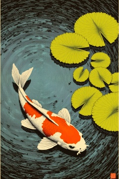 beijihui,A detailed painting of a goldfish swimming in a pond. The goldfish is facing the left side of the frame, its body facing towards the right. Its head is turned to the left, with its eyes facing the right side. Its body is white, with a red stripe running down its back. Its tail is a light orange, with white stripes on it's head. The background of the painting is a dark blue, with black swirls on it. To the right of the goldfish, there are green lily pads floating on the surface of the pond.