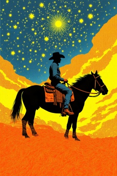 beijihui,Captured at eye-level,a silhouette of a cowboy riding a black horse is seen in a vibrant orange and yellow landscape. The cowboy is wearing a black cowboy hat,a long sleeve shirt,and shorts. The horse's mane is adorned with a saddle,and he is facing towards the right side of the image. To the left of the horse's head,a large rock formation is visible. The background is a deep blue,with yellow stars dotting the sky.,