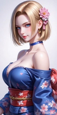 1girl,breasts,solo,japanese clothes,hair ornament,kimono,flower,hair flower,sash,blue kimono,large breasts,choker,looking at viewer,cleavage,bare shoulders,obi,off shoulder,earrings,smile,jewelry,floral print,closed mouth,makeup,from side,long sleeves,