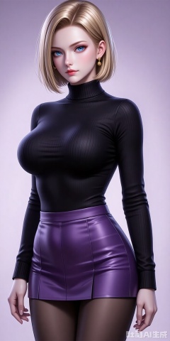 1girl,breasts,skirt,solo,pantyhose,large breasts,purple skirt,covered navel,long sleeves,taut clothes,miniskirt,pleated skirt,turtleneck,black shirt,shirt,black pantyhose,taut shirt,