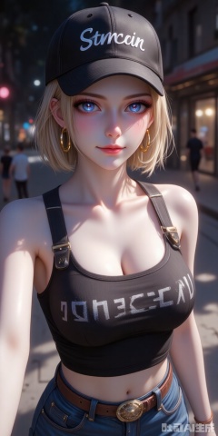 1girl,denim,earrings,navel,jewelry,jeans,belt,pants,baseball cap,solo,hat,shirt,midriff,black shirt,outdoors,sleeveless,selfie,looking at viewer,black headwear,shadow,clothes writing,crop top,makeup,breasts,blurry,closed mouth,sleeveless shirt,smile,lips,night,road,cowboy shot,hoop earrings,bare shoulders,medium breasts,eyeshadow,