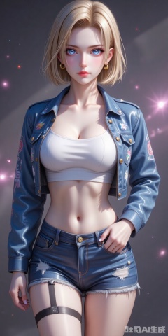 jacket,abs,shorts,cropped jacket,crop top,chest,crop top,looking at the audience,short hair,android 18,blurred background,open jacket,blurred,denim shorts,denim,lips,open clothing,medium chest,blue jacket,thigh straps,clavicle,slightly open lips