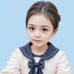 The image shows a young woman with a clear complexion, wearing a white sailor-style outfit with a dark blue collar and bow. Her hair is neatly pulled back into a bun, and she has a calm, neutral expression. The background is a solid blue color, providing a clean and simple backdrop that highlights the subject.
