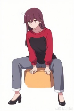 su moting\(god troubles me\),long hair,Red and black sweatshirt,Grey pants,block heels,