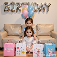 The image shows a person sitting on a beige sofa in a room decorated for a birthday celebration. The person is holding a bunch of colorful balloons, including pink, blue, and gold ones. Behind the person, there are large silver balloons spelling out "BIRTHDAY." In front of the person, there is a table filled with various gift bags and presents, including a pink bag with the text (birthday gift), a white bag with a cartoon character, and a blue bag with a bunny plush toy. The overall setting appears festive and cheerful, with a focus on the celebration.