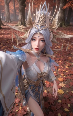 A self of Ningyudie,A self-portrait of an elegant fantasy female character with celestial beauty and a mystical aura,featuring long flowing silver hair,bright blue eyes,red lips,and delicate facial features. She wears an ornate fantasy armor-dress hybrid in white,blue,and gold tones,with feather-like extensions and intricate gold accents. Her attire is complemented by a large ornate headdress with feathers and gold,along with detailed earrings and a necklace showcasing a large blue gemstone. The character is taking a selfie with a shocked expression,one arm extended forward as if holding a camera or smartphone,in a running pose. The shot uses Dutch angle (tilted lens) and motion blur,adding a sense of unease and tension. Behind her,the scene shifts to a beautiful autumn maple forest with leaves falling gently through the air,creating a serene yet dynamic backdrop. The ground is covered with a thick layer of fallen maple leaves in shades of red,orange,and yellow. Rays of sunlight pierce through the canopy,casting soft shadows on the forest floor. The atmosphere feels calm and peaceful,contrasting sharply with the tense posture of the character. Fantasy art style,high detail,cinematic lighting,4K ultra HD.,