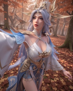 A self of Ningyudie,A self-portrait of an elegant fantasy female character with celestial beauty and a mystical aura,featuring long flowing silver hair,bright blue eyes,red lips,and delicate facial features. She wears an ornate fantasy armor-dress hybrid in white,blue,and gold tones,with feather-like extensions and intricate gold accents. Her attire is complemented by a large ornate headdress with feathers and gold,along with detailed earrings and a necklace showcasing a large blue gemstone. The character is taking a selfie with a shocked expression,one arm extended forward as if holding a camera or smartphone,in a running pose. The shot uses Dutch angle (tilted lens) and motion blur,adding a sense of unease and tension. Behind her,the scene shifts to a beautiful autumn maple forest with leaves falling gently through the air,creating a serene yet dynamic backdrop. The ground is covered with a thick layer of fallen maple leaves in shades of red,orange,and yellow. Rays of sunlight pierce through the canopy,casting soft shadows on the forest floor. The atmosphere feels calm and peaceful,contrasting sharply with the tense posture of the character. Fantasy art style,high detail,cinematic lighting,4K ultra HD.,