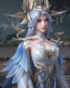 (8k resolution, absolute masterpiece, best quality, ultra detailed),elegant fantasy female character,celestial beauty,mystical aura,long flowing silver hair,bright blue eyes,red lips,delicate facial features,ornate fantasy armor-dress hybrid in white blue and gold tones,feather-like extensions,golden accents,large ornate headdress with feathers and gold,intricate earrings,necklace with large blue gemstone,standing outdoors,full body,looking at viewer,one hand elegantly on hip,other arm up with fingers gracefully extended or gently curved,natural smile,confident and approachable expression,dynamic pose,blurry background,simple gradient background,4K ultra HD,fantasy art style,high detail,cinematic lighting,close-up details,emphasizing graceful hand gestures,adding a touch of dimension to your images without compromising details,