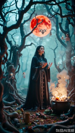 In a haunted forest under a blood - red moon, a witch in a black gothic dress stands beside a bubbling cauldron. The dress is embroidered with arcane symbols in silver thread. Using her magic to create a depth - of - field effect, the gnarled trees and floating spirits blur, spotlighting her as she chants ancient incantations.,vivid color,Oriental Aesthetics