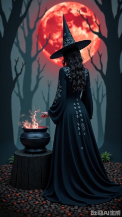 In a haunted forest under a blood - red moon, a witch in a black gothic dress stands beside a bubbling cauldron. The dress is embroidered with arcane symbols in silver thread. Using her magic to create a depth - of - field effect, the gnarled trees and floating spirits blur, spotlighting her as she chants ancient incantations.,vivid color,Oriental Aesthetics