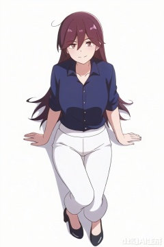 su moting\(god troubles me\),long hair,white pants,blue collared shirt,block heels,