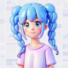 High quality, multi detail, 1 girl, all blue hair, blue hair, pink hair, braids, double braids, blue braids, blue braids, long hair, pompadu hair, bangs, big bangs, silly hair, big silly hair, fluffy hair, T-shirt, upper body, exquisite face, clear eyes, sapphire eyes, newspaper wall, clear newspaper content, 8k, HD,Expansive style