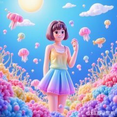 masterpiece, best quality, extreme aesthetic, newest,amazing quality,beautiful color,anime,anime color,line art,line style,A young girl, exquisite and beautiful, with deep-sea fish and various colors of coral and jellyfish, sky,clouds,flowers,plants,sea anemones, corals, psychedelic, various marine creatures, bright color combinations, fantasy7033, sangonomiyakokom, waterM, line art,line style, line art,dress,by mery (yangmalgage),moon,sun,by suda ayaka
