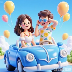Two young and energetic boys and a girl happily sit in a classic blue convertible car.This girl is sitting in the driver's seat, with long wavy brown hair, wearing a white off shoulder sun dress, and surrounded by black fungus edges. She has a cheerful expression, wide open eyes, and a bright smile. Wearing colorful earrings on the ears and a blue yellow fruit necklace around the neck. Wearing a bracelet on the wrist.The boy is standing on the passenger seat. The boy has short brown hair and is wearing a pure white short sleeved shirt with yellow flowers and playful leaf patterns in deep blue, light blue, and green. He also had a smile on his face, with his left hand supporting the sunglasses on his forehead to prevent them from being blown off by the wind, and a delicate watch on his left hand. Holding the girl's shoulder on the right side with your right hand, wearing exquisite blue and yellow woven ropes. Wearing light blue pants. A white belt.The background is a clear blue sky and a few fluffy white clouds, implying a sunny summer day. A few scattered yellow balloons floated in the air, with passing trees on both sides, adding to the festive atmosphere. The interior of this car is decorated with a windshield and steering wheel, giving it a realistic texture. The overall style of the illustrations is bright, colorful, and cartoonish, with smooth lines that give people a playful and whimsical feeling. This photo captures a carefree and joyful moment, emphasizing the happiness and innocence of childhood.,Expansive style
