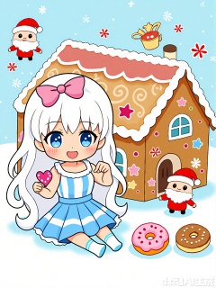 Cute watercolor illustration avatar_Smoke last month, this picture depicts a fantasy scene with a young girl in the center. She has long white hair and a pink bow on her head. Her eyes are big and round and her eyelashes are thick, giving people a playful feeling. She wore a blue and white striped skirt with light blue socks and white shoes. She sat next to a huge gingerbread house decorated with icing and with various decorations such as snowflakes, stars, and items that look like candy. The house also has a window and door, with a small red Christmas hat hanging on it, suggesting a festive theme. Around the gingerbread house, there are two images similar to Santa, one on the left and the other on the right, both wearing red hats. The girl was holding a heart-shaped candy in her hand and a pink donut next to it. The overall atmosphere is warm and joyful, with the background being soft blue and white, adding to the winter festival feel.