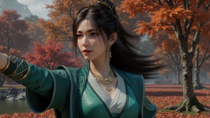 an Asian woman with long dark hair styled in a high ponytail or elegant updo. She is wearing traditional Chinese attire in teal,green,and gold tones with intricate patterns,featuring a high collar,long sleeves,and textured fabric. Adorned with a small gold crown,a gold necklace with geometric pendants,and gold earrings,she conveys an elegant and serious demeanor with imperial and traditional aesthetics.,mupeiling is taking a selfie with a shocked expression,one arm extended forward as if holding a camera or smartphone,in a vlog pose. The shot uses Dutch angle (tilted lens) and motion blur,adding a sense of unease and tension. Behind her,the scene shifts to a beautiful autumn maple forest with leaves falling gently through the air,creating a serene yet dynamic backdrop. The ground is covered with a thick layer of fallen maple leaves in shades of red,orange,and yellow. Rays of sunlight pierce through the canopy,casting soft shadows on the forest floor. The atmosphere feels calm and peaceful,contrasting sharply with the tense posture of the character. Fantasy art style,high detail,cinematic lighting,4K ultra HD.,