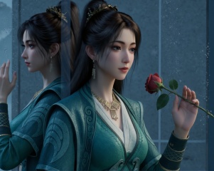 Taking photos through glass,"Photograph capturing Mupeiling through a glass wall,with water flowing downwards. She wears an elegant traditional Chinese attire in teal with intricate patterns and a white inner layer,along with a small gold crown on her head. Her long dark hair is styled in a high ponytail,emphasizing the detailed jewelry and textures. She adorns herself with a gold necklace featuring dangling pendants and matching earrings. Her body leans slightly forward and tilts to the right,aligning with the direction of her head. Her left hand lifts her fingers gracefully,while her right hand holds a red rose against the glass wall. Her expression is calm and mysterious,with eyes directly facing the camera. Her face,neck,and shoulders are covered with tiny,transparent water droplets,softly reflecting light and sparkling. The background features a simplified,holy glass wall behind her,enhancing the tranquil mood.",Taking photos through glass,