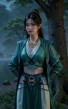 A self-portrait of Mupeiling,"Photograph capturing Mupeiling in a serene natural scene during gentle rain. Mupeiling wears an elegant traditional Chinese attire in teal with intricate patterns and a white inner layer,along with a small gold crown on her head. She also adorns herself with a gold necklace featuring dangling pendants and matching earrings. Her long dark hair is styled in a high ponytail,emphasizing the detailed jewelry and textures. She stands beneath a large tree with a thick trunk and vibrant green leaves,which provides shelter from the rain. Raindrops fall gracefully around her,creating a soft misty effect on the lush foliage. The ground is covered with calm,reflective water that mirrors the tree and sky above. The background features a simplified,dense forest of trees in varying shades of green,contributing to a peaceful and refreshing mood. The image highlights the tranquility and natural beauty,focusing on Mupeiling's detailed outfit and accessories.",