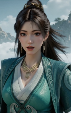 "Portrait of Mupeiling taking a selfie with a shocked expression. She wears an elegant traditional Chinese attire in teal with intricate patterns and a white inner layer, along with a small gold crown on her head. Her long dark hair is styled in a high ponytail. She also wears a gold necklace with pendants and matching earrings. One arm is extended as if holding a camera or smartphone, in a running pose. The photo uses Dutch angle (tilted lens) and motion blur to add a sense of unease and tension. The background is simplified, showing no other characters but featuring a clear and sunny sky with minimal details."