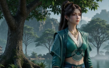 "Photograph capturing Mupeiling in a serene natural scene during gentle rain. Mupeiling wears an elegant traditional Chinese attire in teal with intricate patterns and a white inner layer,along with a small gold crown on her head. She also adorns herself with a gold necklace featuring dangling pendants and matching earrings. Her long dark hair is styled in a high ponytail,emphasizing the detailed jewelry and textures. She stands beneath a large tree with a thick trunk and vibrant green leaves,which provides shelter from the rain. Raindrops fall gracefully around her,creating a soft misty effect on the lush foliage. The ground is covered with calm,reflective water that mirrors the tree and sky above. The background features a simplified,dense forest of trees in varying shades of green,contributing to a peaceful and refreshing mood. The image highlights the tranquility and natural beauty,focusing on Mupeiling's detailed outfit and accessories.",