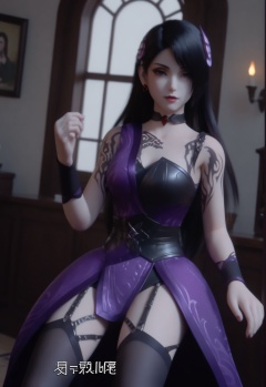 <lora:无名反派7:1>,1girl,solo,long hair,black hair,hair ornament,thighhighs,dress,choker,black thighhighs,indoors,tattoo,garter straps,purple dress,asymmetrical sleeves,