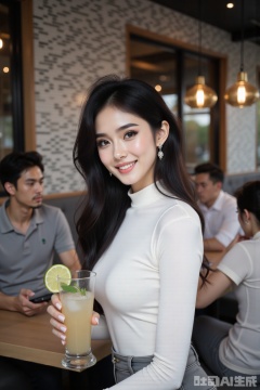 large breasts,This photograph captures a vibrant,modern restaurant setting with a warm,inviting ambiance. In the foreground,a young woman with long straight black hair and fair skin smiles directly at the camera and large breasts,She is wearing a form-fitting,white,long-sleeved top that accentuates her slender figure. In her right hand,she holds a tall,clear cocktail glass filled with a light-colored drink garnished with a lime wedge and a green herb sprig. The woman appears to be in her early twenties. In the background,there are several patrons engaged in various activities. A man in a gray polo shirt,likely in his thirties,is seated at a table,intently focused on his smartphone. Another man,also in his thirties,is wearing a white shirt and is engaged in conversation with a woman seated across from him. Both are sitting on padded,gray benches with light wood tables. The restaurant's interior is stylish,with a mix of modern and rustic elements. The walls are adorned with a mosaic pattern of gray and white tiles,and there are pendant lights with warm,yellowish light fixtures hanging from the ceiling. The overall atmosphere is cozy and sophisticated,with a focus on comfort and good food.,