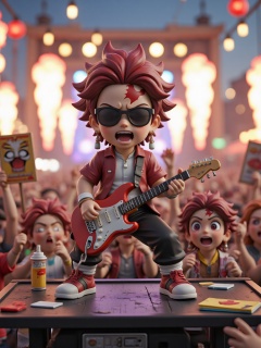 3D Tanjiro is wearing rock - style clothing, sunglasses, holding an electric guitar, with a wild expression, playing passionately.The scene is a lively rock music festival. The stage is filled with flashing lights, and the audience is cheering madly. There are various uniquely - shaped posters and decorations around.