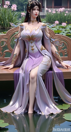 (masterpiece:1.2), best quality, A stunning young woman sits elegantly on a intricately carved wooden bench amidst a serene pond, surrounded by vibrant lily pads and lush greenery. She wears a exquisite purple and white dress with delicate pink and gold embroidery on the chest and short sleeves, paired with gold high heels. Her long, dark hair cascades in loose waves, framing her gentle face. One hand rests on her hip, while the other holds a majestic lotus, exuding tranquility. The background is a kaleidoscope of pink and white lotus flowers, set against a subtle traditional Chinese architectural backdrop, (huge breasts:2.99),(full breasts:2.99),(Background with traditional Chinese architecture, lotus pond and pink lotus flowers:1.59),Xhanfududou,Xsongzhihanfu,Xlujiajia,Xyanqingfei,XfuqingyunY,Xtangqixiongshanqun,Xfeitianhanfu,Xqinghannu,XmeijiX2,XmeijiX,XlingyuyxiuX2,XlingyuyxiuX,Xjianglishenwang,Xjianglishenwang2